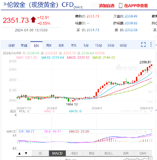 4月9日,现货黄金短线走高,刷新历史高位至2356.81美元/盎司。