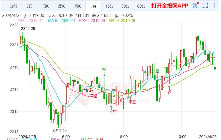 现货黄金周三收盘下跌0.27%,报2315.81美元/盎司。周四,美国将公布第一季度国内生产总值(GDP)的初值,预计该数据将显示,截至3月份的三个月,美国经济年化增长率为2.5%。