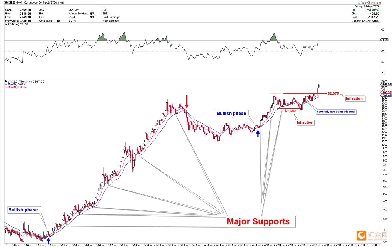 Umair总结提到,从技术角度来看,黄金图表上观察到的看涨模式表明对价格持续上涨的预期。上升楔形和倒转头肩形态的形成,以及最近突破2075美元水平,表明金价处于稳固的看涨阶段,有可能将金价推3000美元大关。
