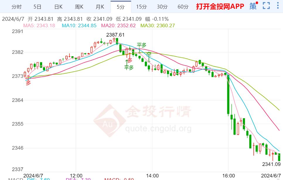 周五(6月7日)本交易日现货黄金日内维持震荡走势,今日开盘报2376.13美元/盎司,最高触及2387.63美元/盎司,最低触及2340.40美元/盎司,截止发稿金价报2341.55美元/盎司,跌幅1.45%。金价也延续了上一交易日的涨势。受美元走软推动,现货黄金周四收盘大涨20.72美元,涨幅0.88%,报2375.83美元/盎司。