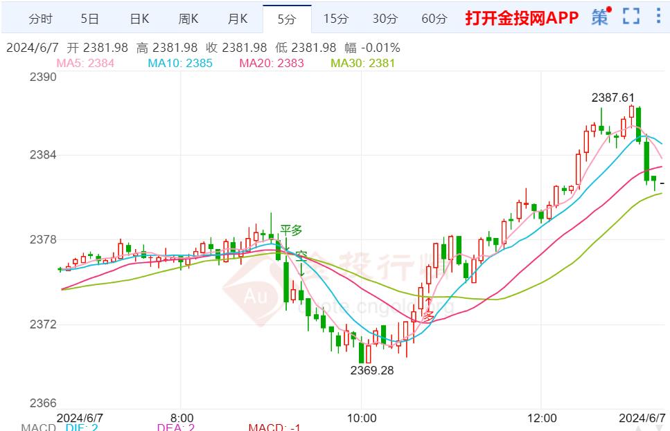 周五(6月7日)本交易日现货黄金日内维持震荡走势,今日开盘报2376.13美元/盎司,最高触及2387.63美元/盎司,最低触及2369.25美元/盎司,截止发稿金价报2381.98美元/盎司,涨幅0.26%。