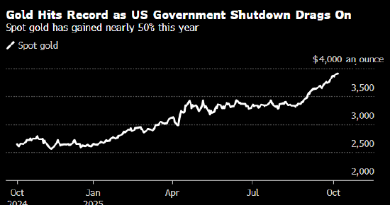 美国政府停摆持续引发避险需求 金价刷新历史高位