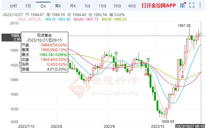 本周五,10月27日黄金盘内开启小幅涨势,日内金价区间内调整,北京时间10:44,黄金暂报1987.50。