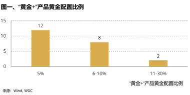 狭义的“黄金+”指的是一类具体产品,业绩基准或资产配置策略中配置5%以上黄金的多资产组合称为“黄金+”产品。目前,公募基金(含FOF及养老FOF)和银行理财市场已出现各类配置了黄金的“黄金+”产品。市场上有公开数据的“黄金+”产品,大部分配置了5%至10%的黄金,个别产品黄金配置比例达到30%。