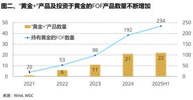 广义的“黄金+”则指的是一种配置理念,它将黄金嵌入到多资产组合中的配置之中,作为风险对冲与收益平滑的重要因子。除“黄金+”产品持续扩容外,专业机构对黄金的直接投资也显著增长。过去几年,配置黄金ETF的FOF产品数量几乎每年翻倍,体现出专业机构对黄金配置价值的共识正在形成。