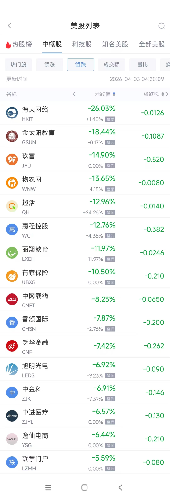领跌中概股列表: