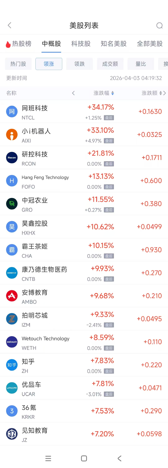 领涨中概股列表: