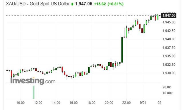 现货黄金最高涨16美元或涨0.8%,升破1940美元整数位并徘徊日高1947美元一线,创9月1日以来的近三周盘中最高。