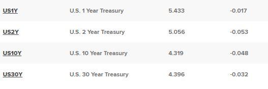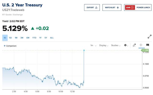 美股午盘时,美债收益率集体回落5个基点。对货币政策更敏感的两年期收益率日内跌幅较深,此前最深跌近6个基点下逼5.05%,昨日曾升破5.10%并接近2007年以来最高位。