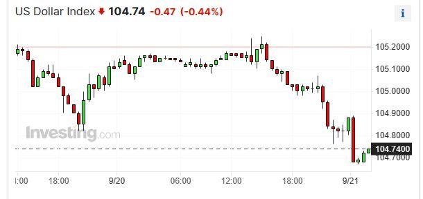 衡量兑六种主要货币的一篮子美元指数DXY跌0.4%至104.76,稍早最深跌0.5%并失守105关口,抹去上周四以来涨幅,当时曾触及105.43至六个月最高。