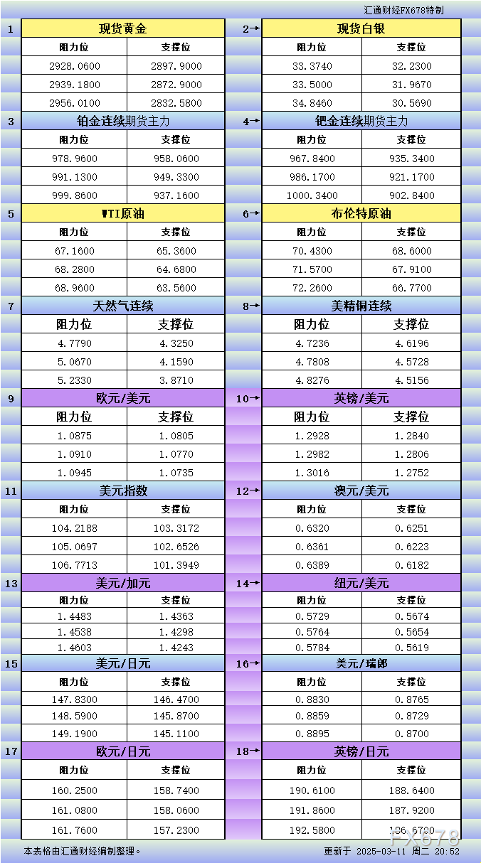 财经APP讯——3月11日美市更新的黄金、白银、铂金、钯金、原油、天然气、铜(商品)以及:美元指数、欧元、英镑、日元、瑞郎、澳元、加元、纽元(热门货币对)的支撑阻力位一览。