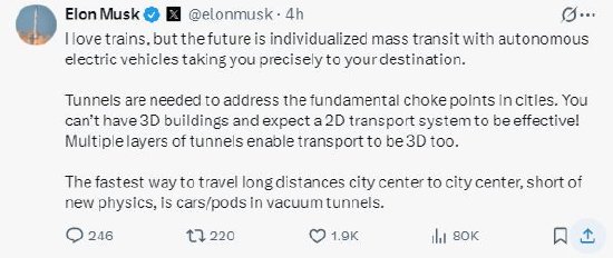 马斯克在回应一条关于其隧道钻探公司Boring Company的帖子时称:“我喜欢火车,但未来是个性化的公共交通,自动电动汽车将带你精确地到达目的地。