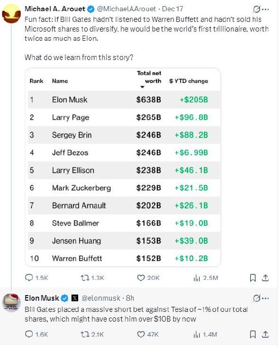 一位网友在X平台上分享最新的全球富豪排行榜并评论称:“如果比尔·盖茨没有听沃伦·巴菲特的话,没有出售他所持的微软股票来分散投资,他将是世界上第一个万亿美元富翁,身价是埃隆的两倍。”