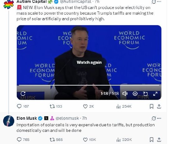一位网友在X上分享了马斯克在达沃斯世界经济论坛上的讲话片段,马斯克表示,美国无法大规模生产太阳能电力来满足全国的能源需求,因为特朗普的关税政策人为地抬高了太阳能发电的价格,使其高得令人难以承受。